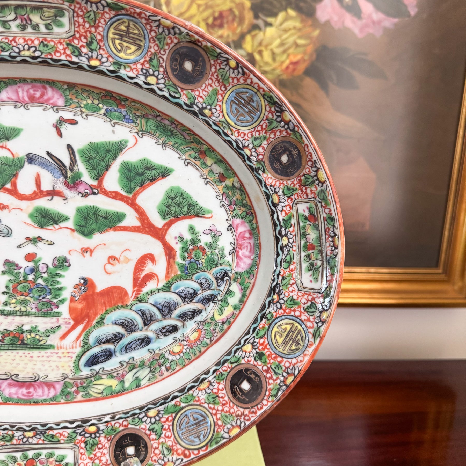 A stunning and rare antique famille rose platter. This design features the signature greens and pinks that are characteristic of Famille Rose porcelain, with two central kylin, mythical creatures from Chinese folklore, set within a detailed landscape scene. The border is accented with six coins, adding an extra layer of symbolism to this pretty pattern.