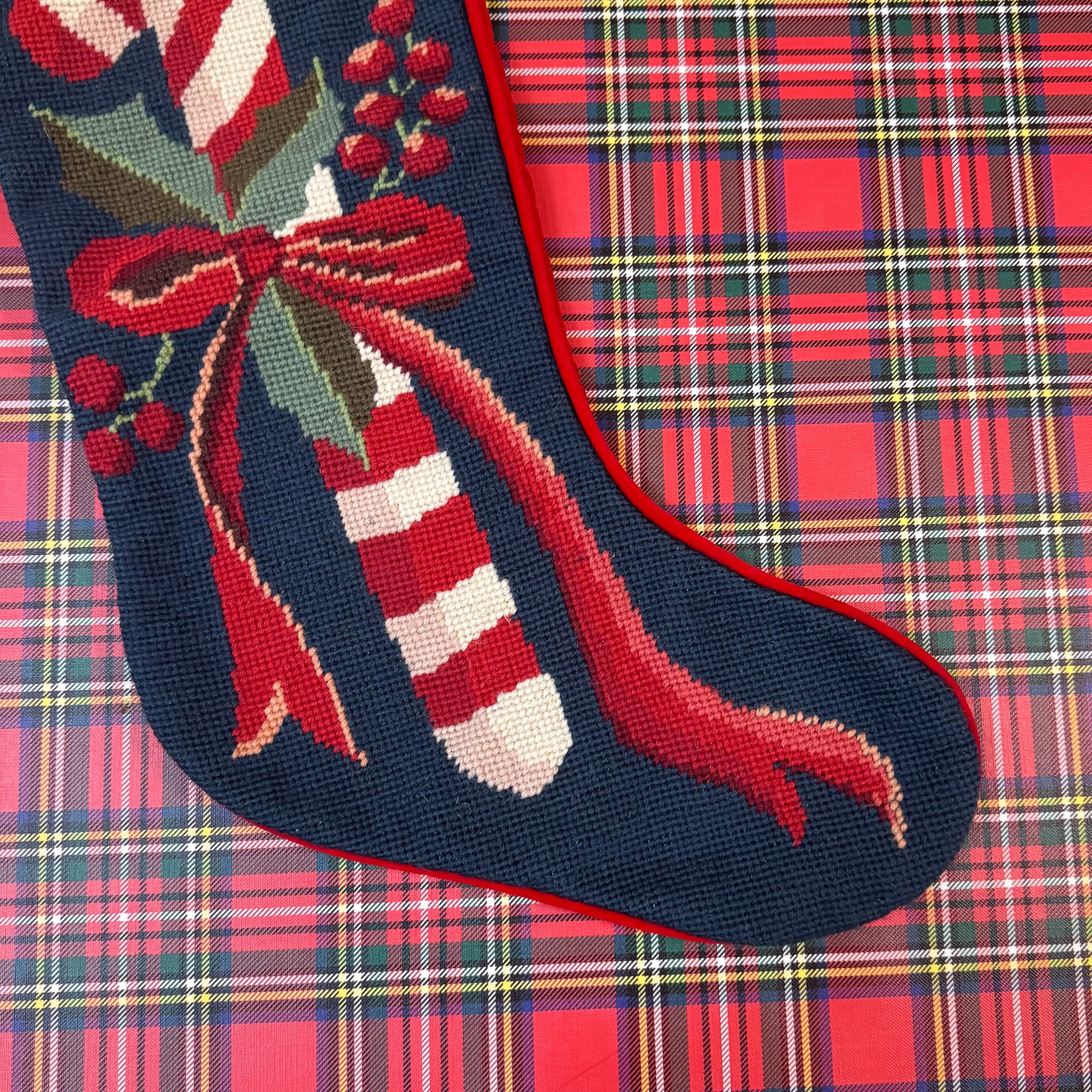 A classic needlepoint Christmas stocking featuring a red and white candy cane with light pink accents, holly and a bright red bow. Such a pretty stocking!