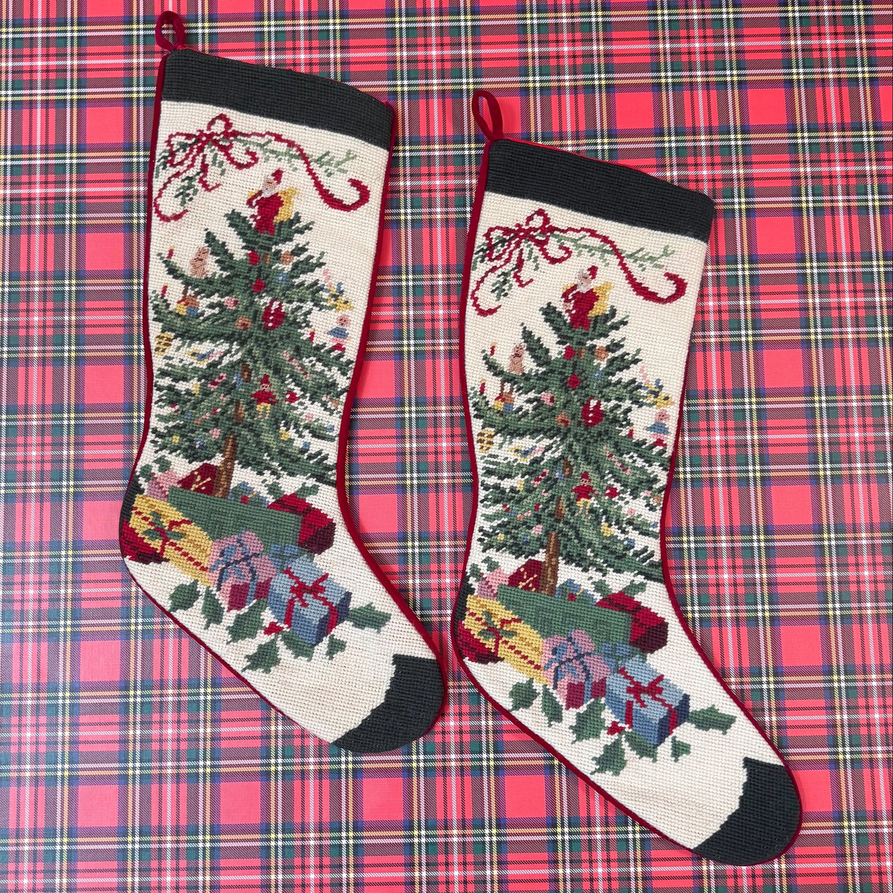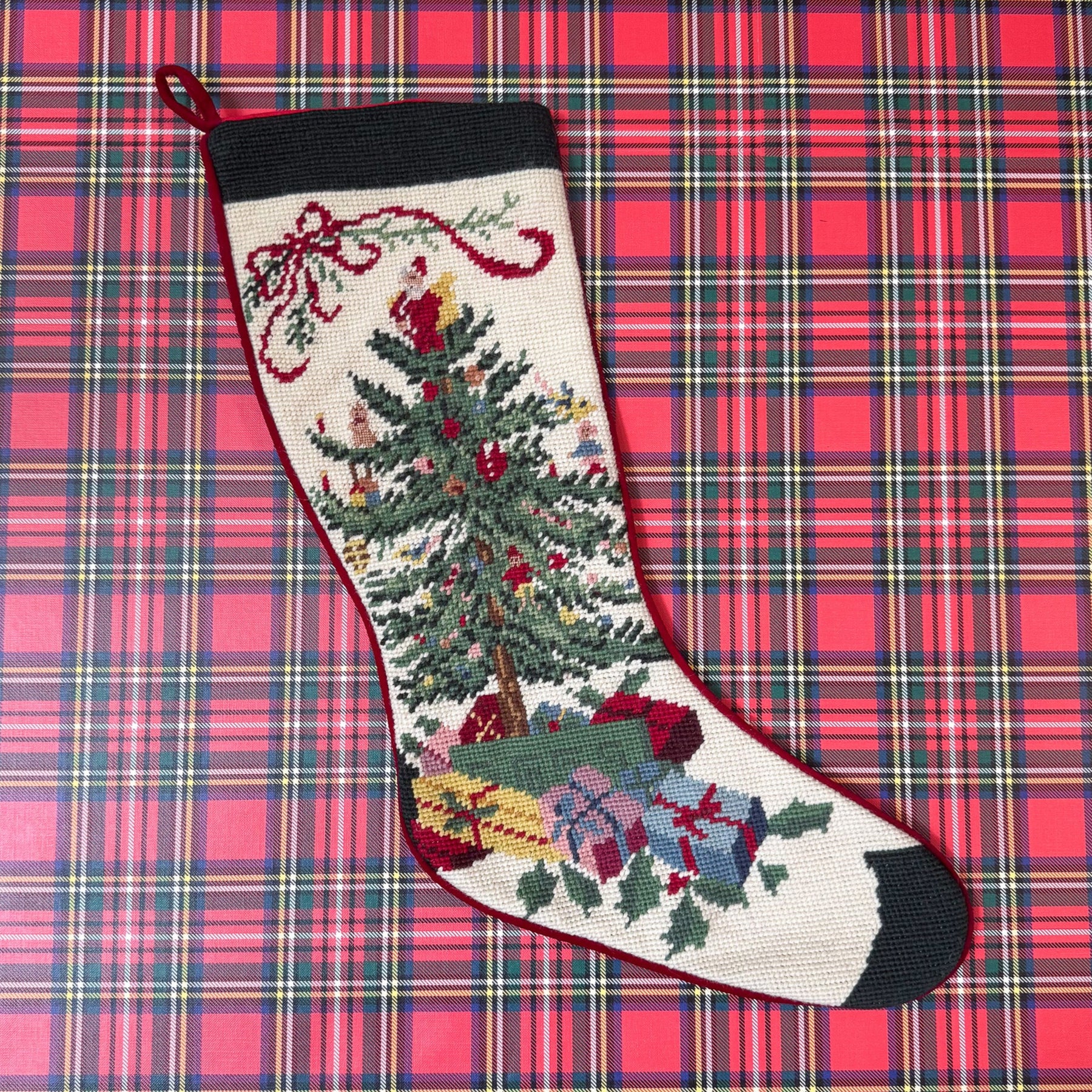 A darling vintage needlepoint stocking, featuring a Christmas tree and presents inspired by the Spode Christmas Tree china pattern. The upper left corner feature sweet red bow, and the back has been finished in a burgundy velvet. A classic stocking that is sure to be enjoyed for many years to come!