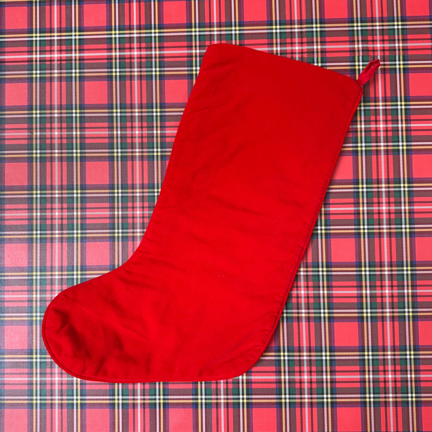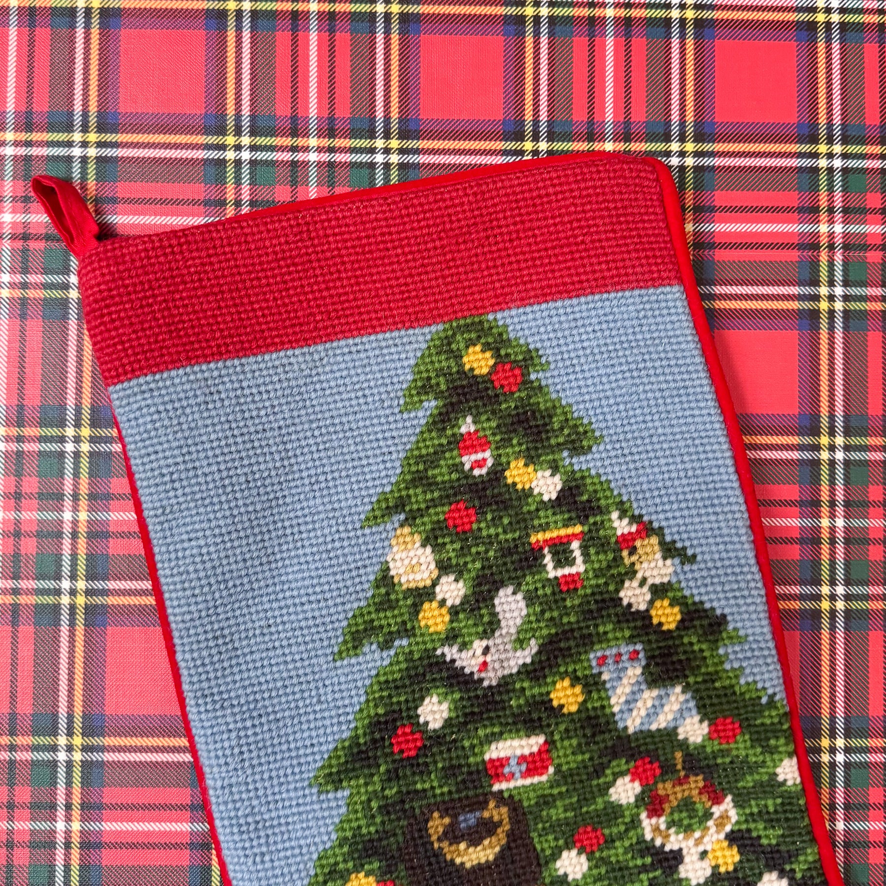 A darling vintage needlepoint stocking featuring a nutcracker in front of a Christmas tree with toys on top of a bright blue background! I love how perfectly this blue pops with the classic red and green shades.