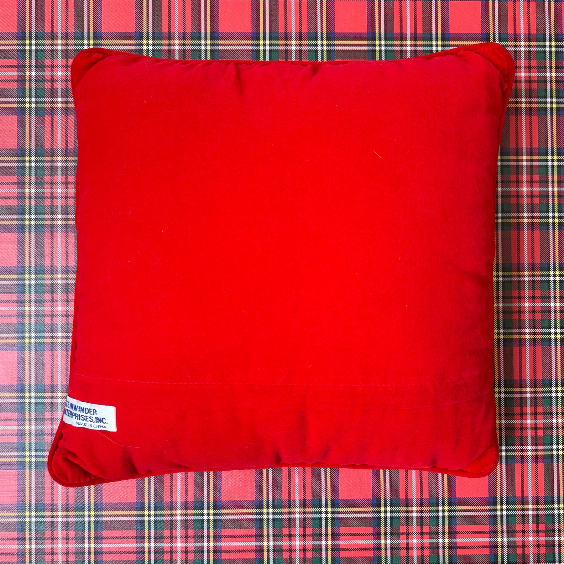A cute vintage Christmas needlepoint pillow featuring a bright ref and green candy cane with holly and a bow! Each corner features a pretty red bow against a navy background. Perfect for adding a little Christimas to a bench, chair or sofa this holiday season!